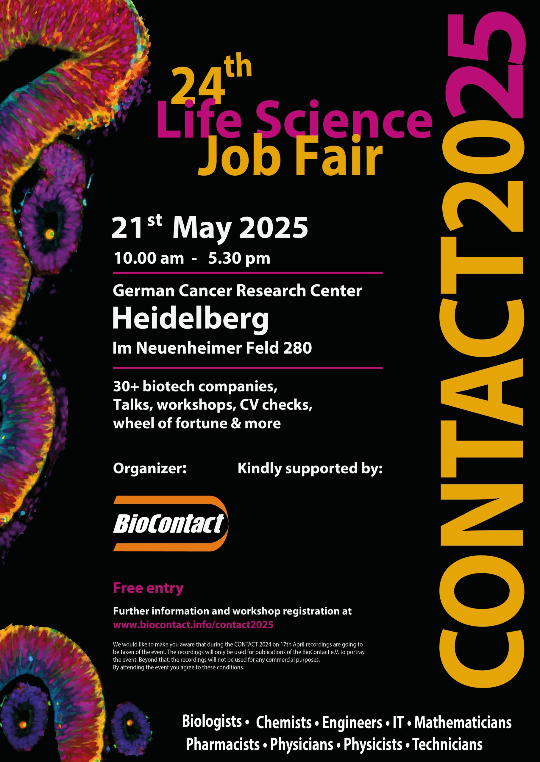Der Verein BioContact e.V., der die Messe nun bereits seit über 20 Jahren organisiert und veranstaltet, ermöglichte den Besuchern der Messe eine Hybridveranstaltung, bei der Vorträge und Workshops der ausstellenden Firmen im Kommunikationszentrums des DKFZ besucht werden konnten und gleichzeitig online live übertragen wurden. Zahlreiche Besucher, darunter Studenten, Doktoranden, Naturwissenschaftler und Mediziner nutzten die Gelegenheit mithilfe eines Zeitslot-Systems direkt mit den Firmen in Kontakt zu treten und Informationen über Karriere- und Einstiegsmöglichkeiten zu sammeln. Für viele Firmen war es nach einer langen Zeit und vielen virtuellen Messen die erste Präsenzmesse mit direktem Kontakt zu den interessierten Besuchern.
